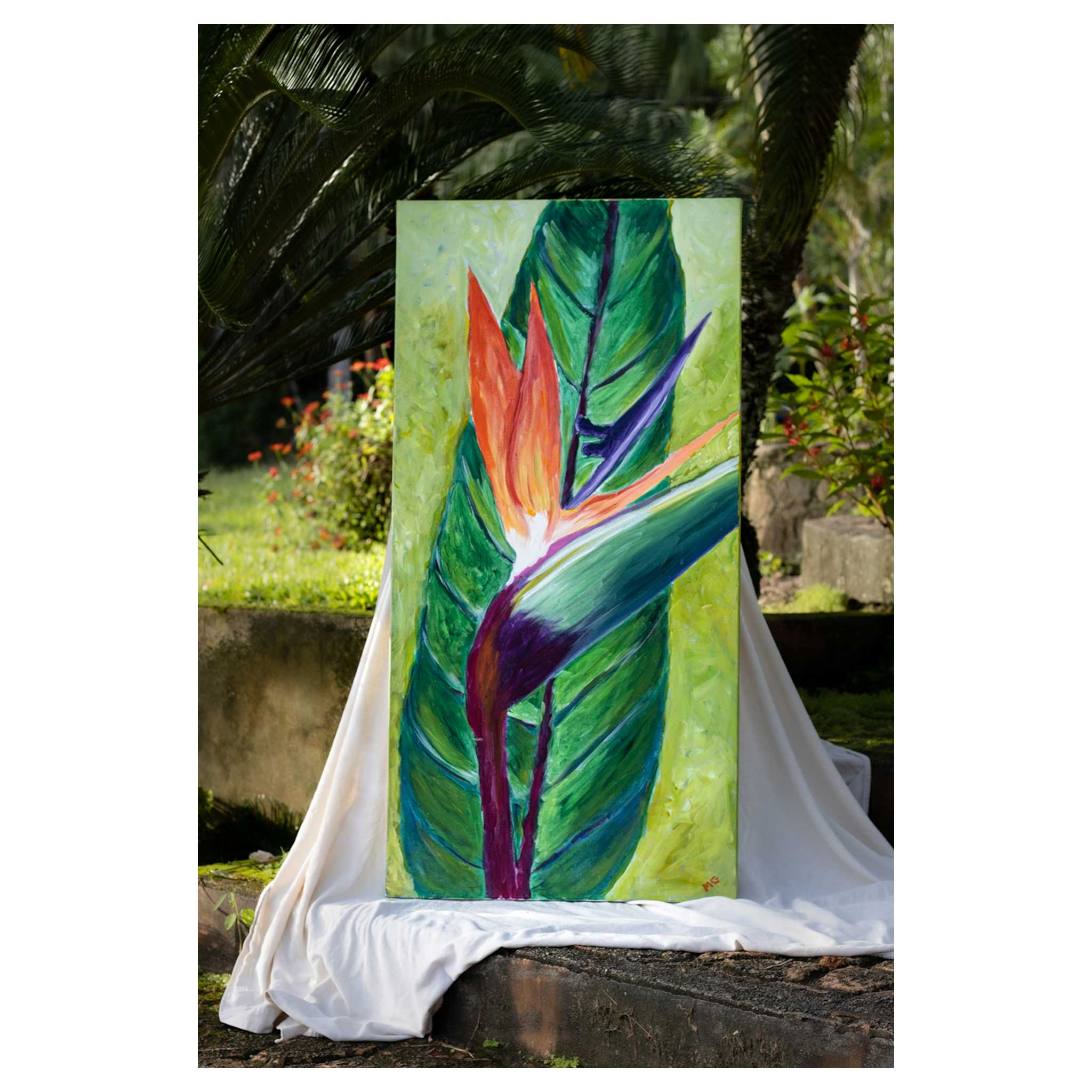 Rich purple and green expression of tropical bird of paradise.