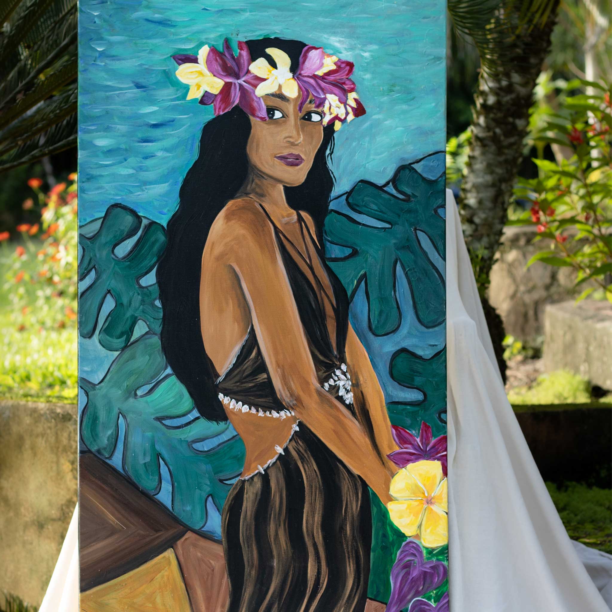 Tropical girl with bouquet of flowers.